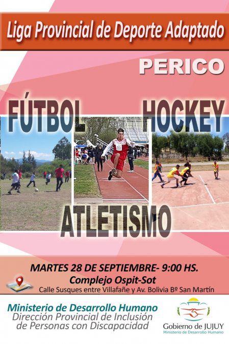 El Ministerio de Desarrollo Humano, a través de la Dirección Provincial de Inclusión de Personas con Discapacidad llevará a cabo la 2ª fecha de la Liga Provincial de Deporte Adaptado en la ciudad de Perico el día martes 28 de septiembre en las instalaciones del Complejo OSPIT-SOT ubicado en calle Susques entre Villafañe y Av. Bolivia del Bº San Martín, a partir de las 9 Hs.