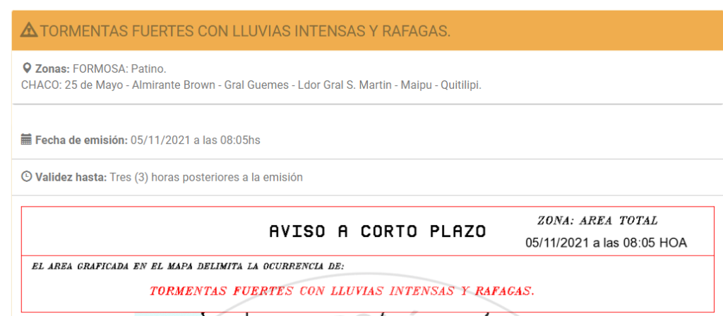 Las Alertas Amarilla y Naranja, que emitió el Servicio Meteorológico Nacional, inició este viernes 5 de noviembre, poco mas de las 8 de la mañana y alcanza a 8 provincias, entre ellas se encuentran las mas afectadas. Formosa y Chaco tiene una Alerta Naranja a corto plazo, por tormentas fuertes con lluvias intensas