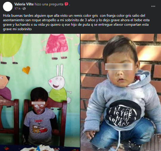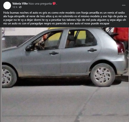 La familia del nene, realizó publicaciones en redes sociales y grupos de Facebook, solicitando al conductor “si estas leyendo esto por favor hacete cargo de lo que hiciste no le pudiste haber hecho eso a mi hijo todo por ir con el celular en la mano”.