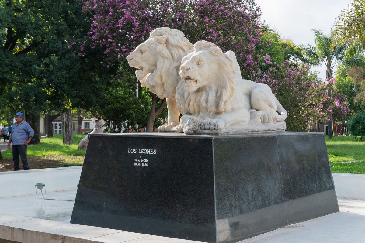 Los Leones, La Libertad, La Paz, La Justicia, El Progreso y El Trabajo fueron realizadas en mármol de carrara, en 1906. Y a lo largo de su vida sufrieron diferentes traslados, siendo el mas importante el que las trajo a nuestra provincia hacia 1922. Los Leones, fue la escultura que mayor cantidad de traslados sufrió, inicialmente localizados en los jardines de Casa de Gobierno, luego en el Parque San Martín, en la antigua plazoleta Maipú, en la plaza del barrio Cuyaya, en la intersección de calle Dorrego y José de la Iglesia, y actualmente en la plaza Hipólito Irigoyen, también conocida como “Plaza de los Leones”.