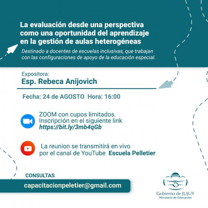 El Ministerio de Educación, informa que el día 24 de agosto, se realizará la Capacitación Virtual denominada «la evaluación desde una perspectiva como una oportunidad del aprendizaje en la gestión de aulas heterogéneas», a cargo de la Profesora Rebeca Anijovich.