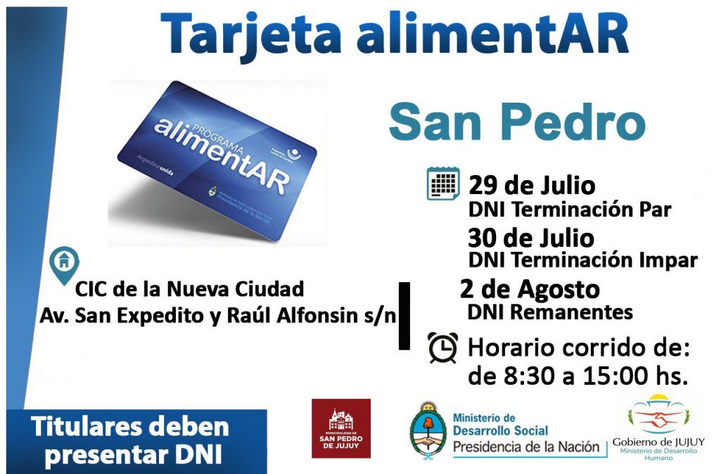 Ell Ministerio de Desarrollo Humano comunica a las personas titulares de la AUH que este jueves 29 de julio se entregarán las Tarjetas AlimentAR en Aguas Calientes, Fraile Pintado, Yuto, La Esperanza, Libertador Gral. San Martín y San Pedro.