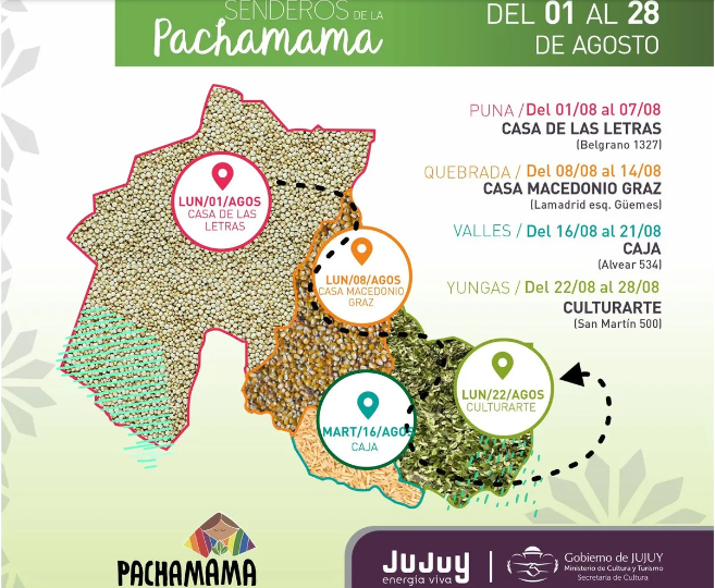 Hasta el sábado 6, Casa de las Letras es protagonista de Senderos de la Pachamama - Región Puna; el viernes 5 en Culturarte se inaugurara el Homenaje a Maestras y Maestros del Arte de Jujuy y además se desarrollan diferentes Fiestas patronales y ceremonias de Pachamama.