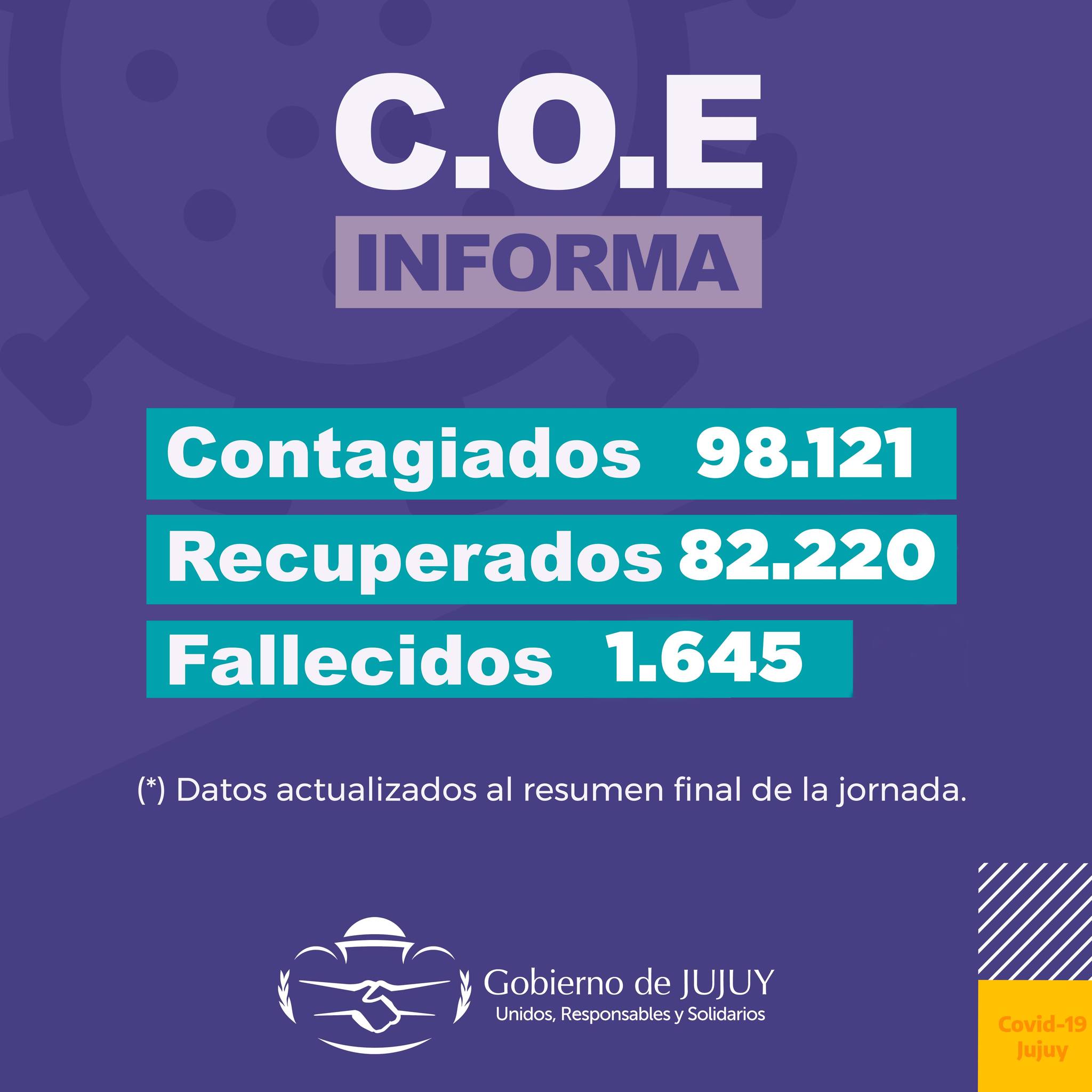 Se notificó 1 fallecimiento por Covid-19: una mujer de 91 años de edad. Cabe aclarar que los fallecimientos son reportados e informados por el Registro Civil de la Provincia de Jujuy y corresponden a días anteriores.