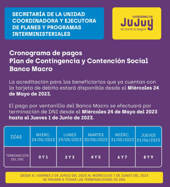 Por último, se adelantó que, desde el viernes 2 de junio del 2023 al miércoles 7 de junio del mismo mes, se pagará a todas las terminaciones de DNI.