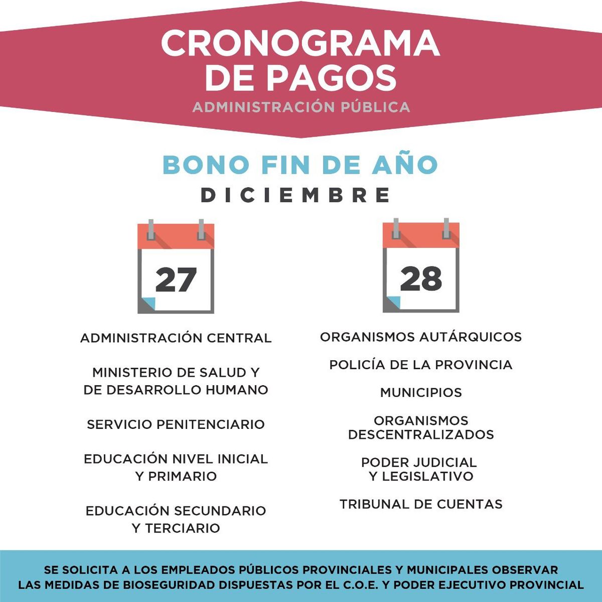 El Gobierno de la Provincia, a través del ministerio de Hacienda y Finanzas, informa a la administración pública que a partir del día 27 de diciembre inicia el pago del bono de fin de año, mientras que el día 28 del corriente finaliza dicho cronograma.