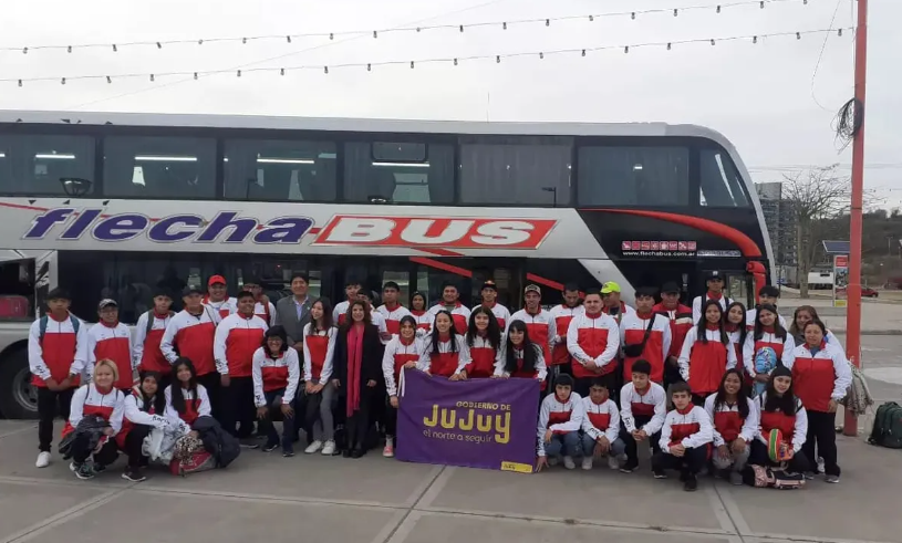 La ministra de Desarrollo Humano Alejandra Martínez junto al secretario de Deportes y Recreación profesor Hugo Flores despidieron a la delegación jujeña compuesta por 50 personas, varones y mujeres, que emprendió el viaje hacia la provincia de Buenos Aires para participar del 23 al 27 de agosto de los Juegos Nacionales Evita Urbanos.