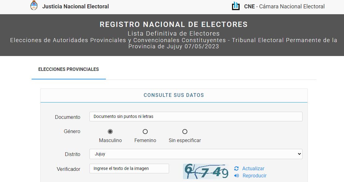 Teniendo en cuenta el desdoble de las Elecciones 2023, que se realizarán el 7 de mayo, en la provincia de Jujuy, es indispensable conocer donde en que mesa y colegio votaran cada uno de los sufragantes.