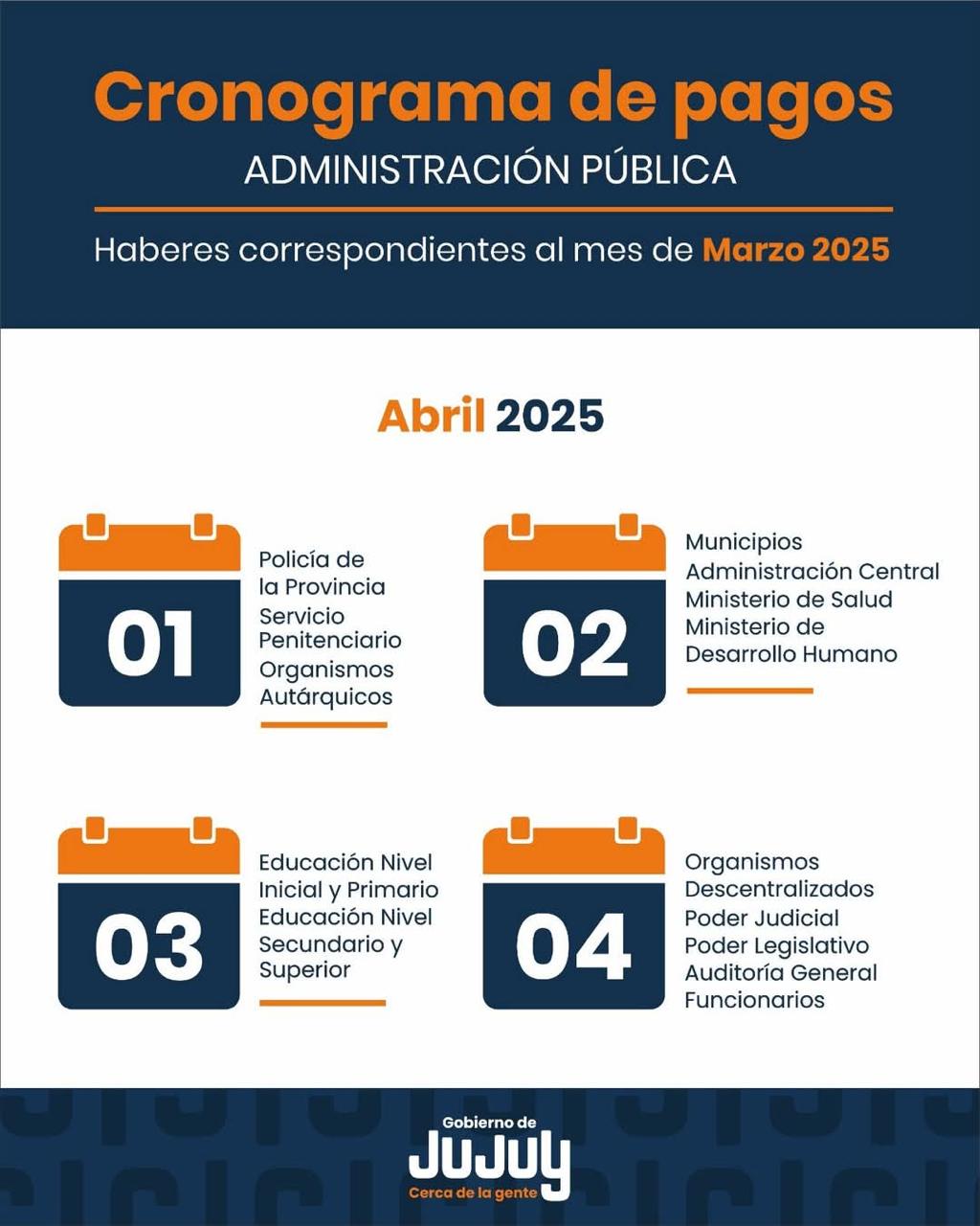El Gobierno de la Provincia de Jujuy difundió el cronograma de pagos de haberes, correspondientes al mes de marzo 2025, para los empleados de la administración pública provincial que se iniciara el 1 de abril.