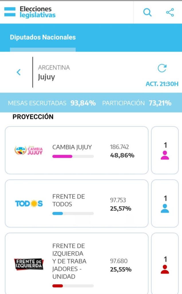 186.742 votos fueron los que le brindaron el triunfo al Frente Cambia Jujuy, sin embargo, la izquierda hizo una eleccion histórica y según indican los números provisorios Alejandro Vilca entraría como Diputado Naciona, y le seguiría Leila Chaher