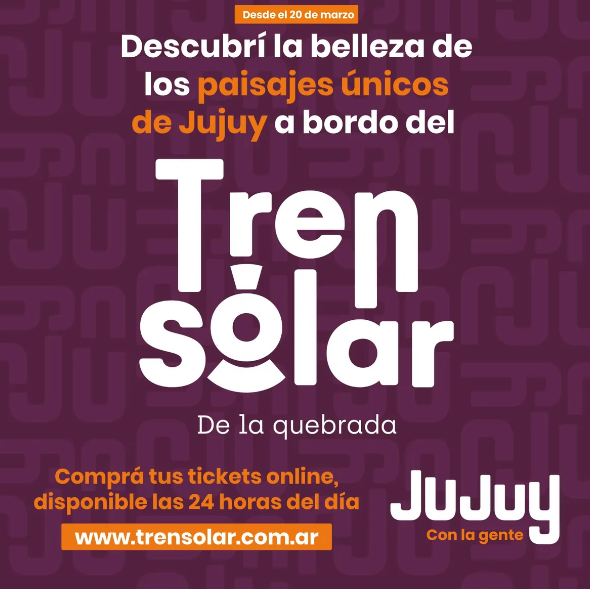 A partir de este lunes, 18 de marzo, en el sitio www.trensolar.com.ar se podrán adquirir los pasajes para el Tren Solar de la Quebrada, cuyos servicios turísticos se habilitarán oficialmente el miércoles 20 del corriente, uniendo Volcán, Tumbaya, Purmamarca y Maimará.