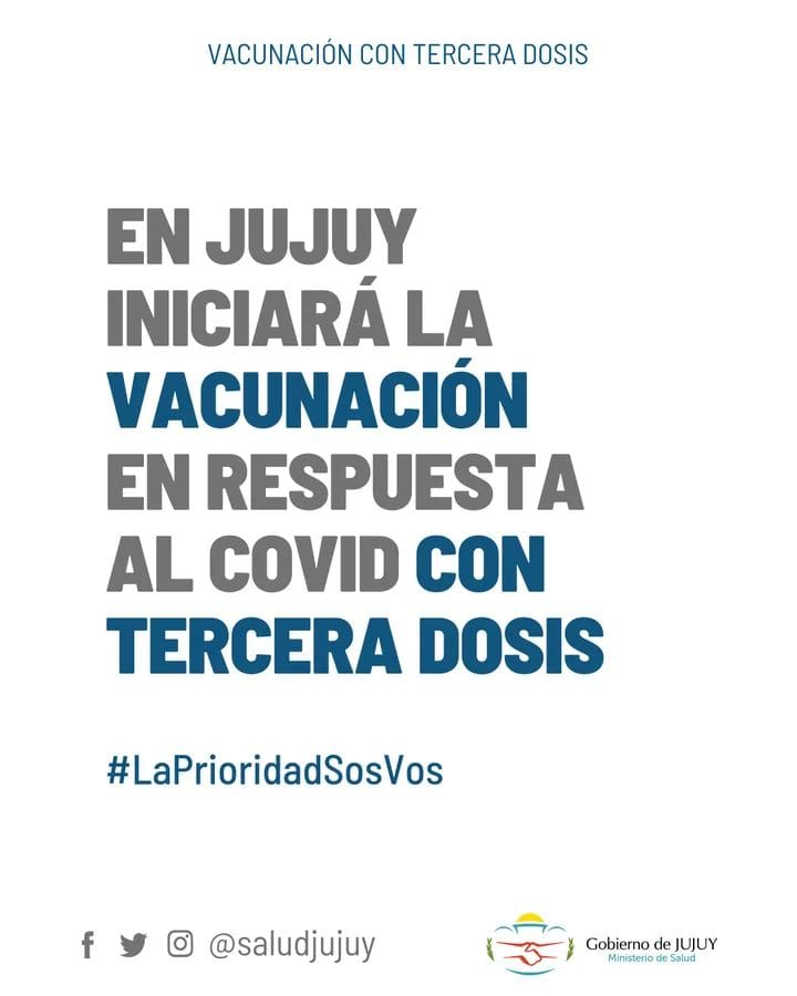 El Ministerio de Salud de Jujuy dio a conocer los detalles para la vacunación con dosis adicional o tercera dosis en respuesta al Covid-19 a iniciar desde el próximo lunes y destinada para personas de 50 años de edad en adelante con esquema completo de Sinopharm, quienes deberán presentar DNI y carnet de vacunación, y para personas inmunocomprometidas (en tratamiento oncológico, personas trasplantadas o en lista de espera, personas con inmunosuficiencia, personas con VIH y personas en tratamiento activo con corticosteroides en dosis altas o medicación inmunosupresora) desde los 3 años de edad en adelante quienes deberán presentar DNI, carnet de vacunación y certificado médico correspondiente; en ambos casos siempre que hayan transcurrido al menos 28 días (4 semanas) desde la aplicación de la segunda dosis.