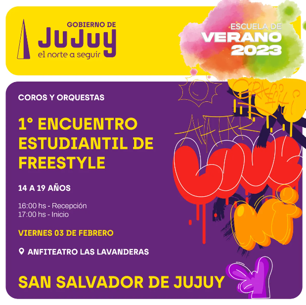 En el marco de las actividades de la Escuela de Verano 2023, el Ministerio de Educación a través de la Subsecretaría de Equidad Educativa, invita a jóvenes de entre 14 y 19 años a sumar su voz en el Primer Encuentro Estudiantil de Freestyle «The battle of dreams», que se llevará a cabo el viernes 3 de febrero en el Anfiteatro Las Lavanderas.