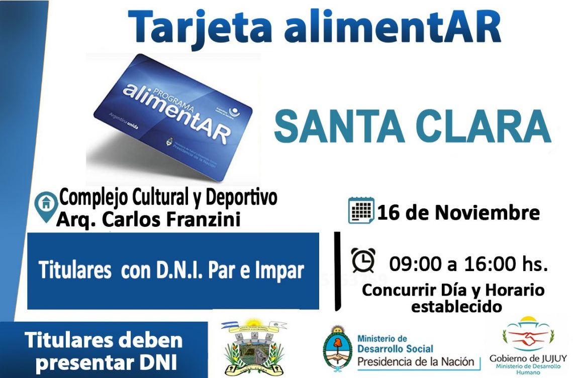 En el marco del Plan Nacional “Argentina contra el Hambre”, el Ministerio de Desarrollo Humano, a través la Secretaría de Asistencia Directa y Calidad de Vida y el municipio local, realizarán la entrega de las tarjetas AlimentAR el lunes 16 de noviembre de 9 a 16 horas, a las personas titulares que actualizaron sus datos y cumplen con todos los requisitos.