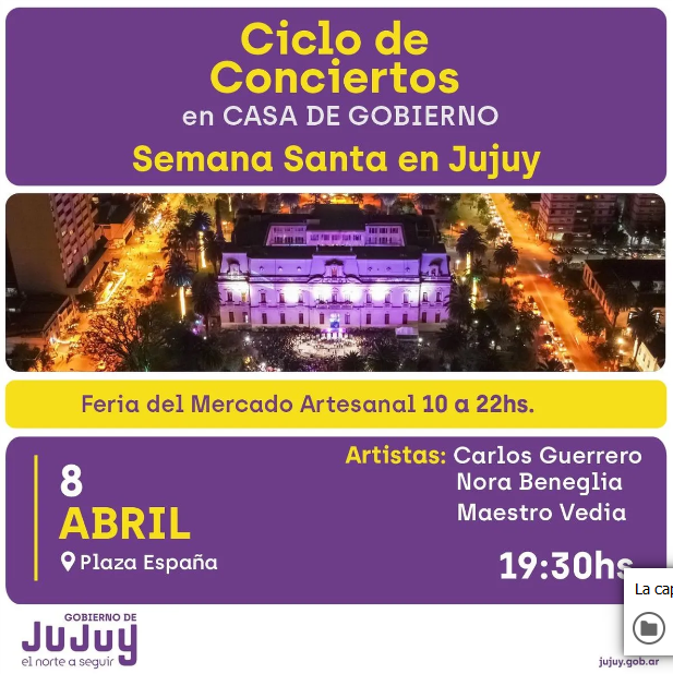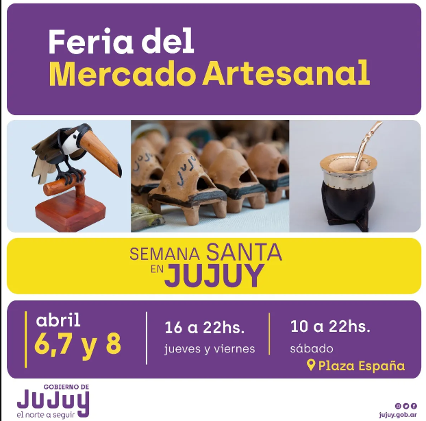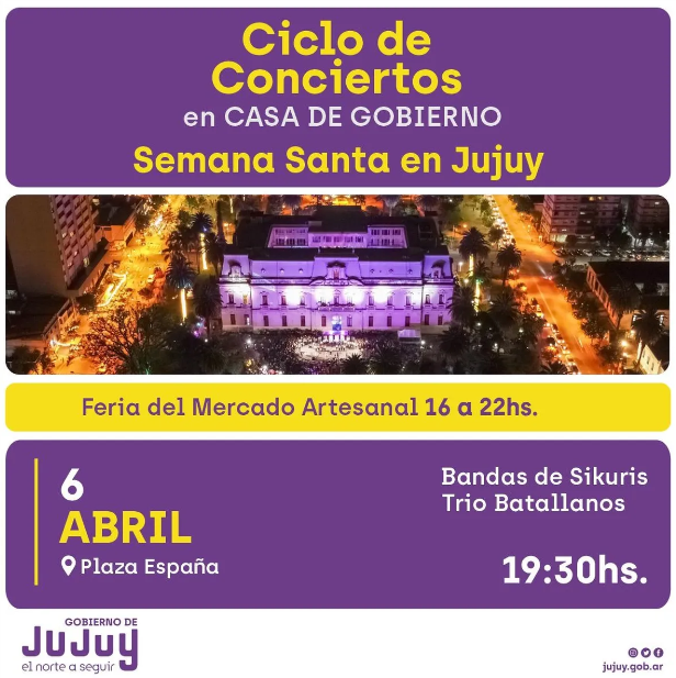 La Secretaría de Cultura invita a la comunidad en general a participar de la programación prevista para los días 6, 7 y 8 del presente mes, en el marco del Ciclo de Conciertos en Casa de Gobierno, denominada “Semana Santa en Jujuy”, donde habrá espectáculos el Jueves y Sábado, en Plaza España. También artesanos y artesanas de las 4 Regiones, mostrarán y venderán su producción en la Feria del Mercado Artesanal, durante los tres días.