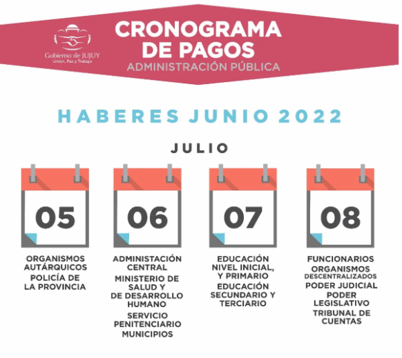 El día miércoles 6 de Julio percibirán sus haberes los agentes de Administración Central, Ministerio de Salud, Ministerio de Desarrollo Humano, Servicio Penitenciario y Municipios.