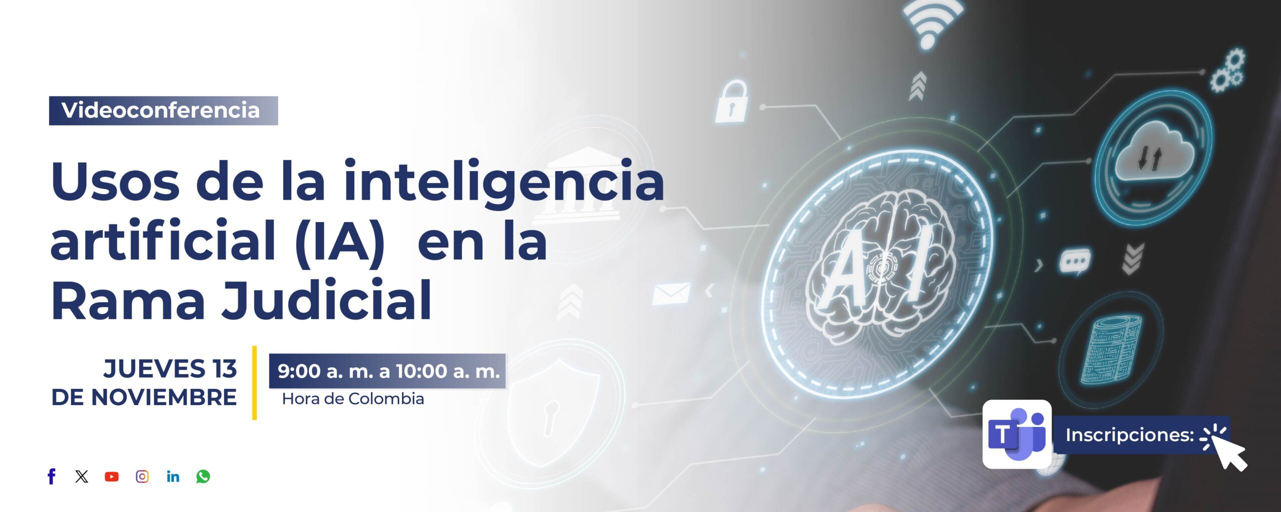 El Consejo Superior de la Judicatura, a través de la Escuela Judicial «Rodrigo Lara Bonilla», invita los servidores judiciales del país, abogados litigantes, defensores públicos, procuradores, fiscales, servidores públicos de distintas entidades, autoridades indígenas, operadores de justicia comunitaria, estudiantes de las facultades de derecho y a la comunidad en general a participar en la videoconferencia denominada: Usos de la inteligencia Artificial (IA) en la Rama Judicial.