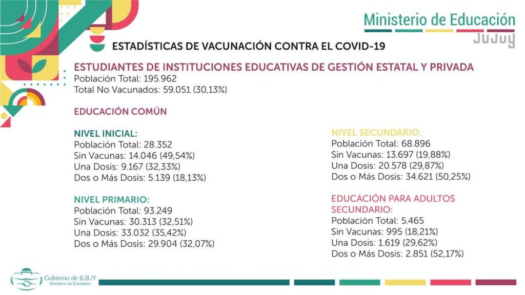 Al respecto Bovi precisó que “del total de 195.962 estudiantes registrados en los distintos niveles educativos, 59.051 no están vacunados contra el Covid- 19”, siendo el nivel Inicial el que mayor porcentaje presenta seguido del nivel Primario, con el 32% de adolescentes desprovistos del inoculante contra el virus.