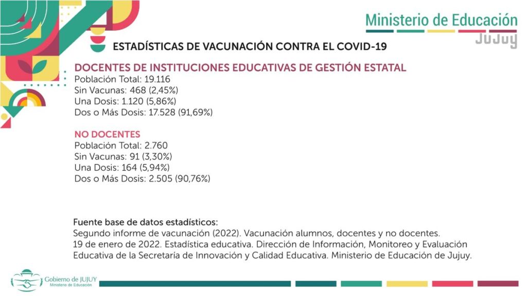 En cuanto al sector docente, la ministra de Educación informó que “la cantidad de vacunados con la primera, segunda y tercera dosis creció” y puntualizó que “del total de 19.116 docentes solo 468 no recibieron ninguna dosis” y añadió que “el cuerpo docente está protegido con las tres dosis, pero el estudiantado no, porque es una decisión de los papás”. Respecto al inicio de clases, previstas para el 2 de marzo próximo, Bovi garantizó la presencialidad en las escuelas. “Por ahora la presencialidad es plena porque los docentes están protegidos” indicó, a su vez informó que “en el caso de que los contagios crezcan se aplicarán nuevamente las burbujas y se hará llegar el material a estudiantes que tienen difícil acceso a la conectividad”.