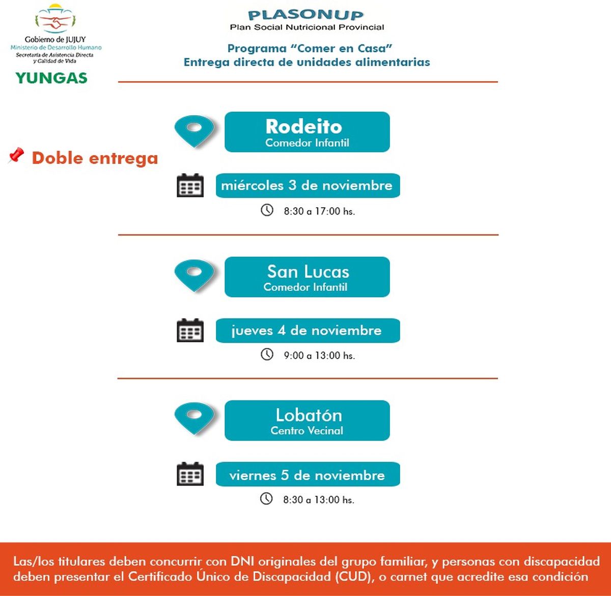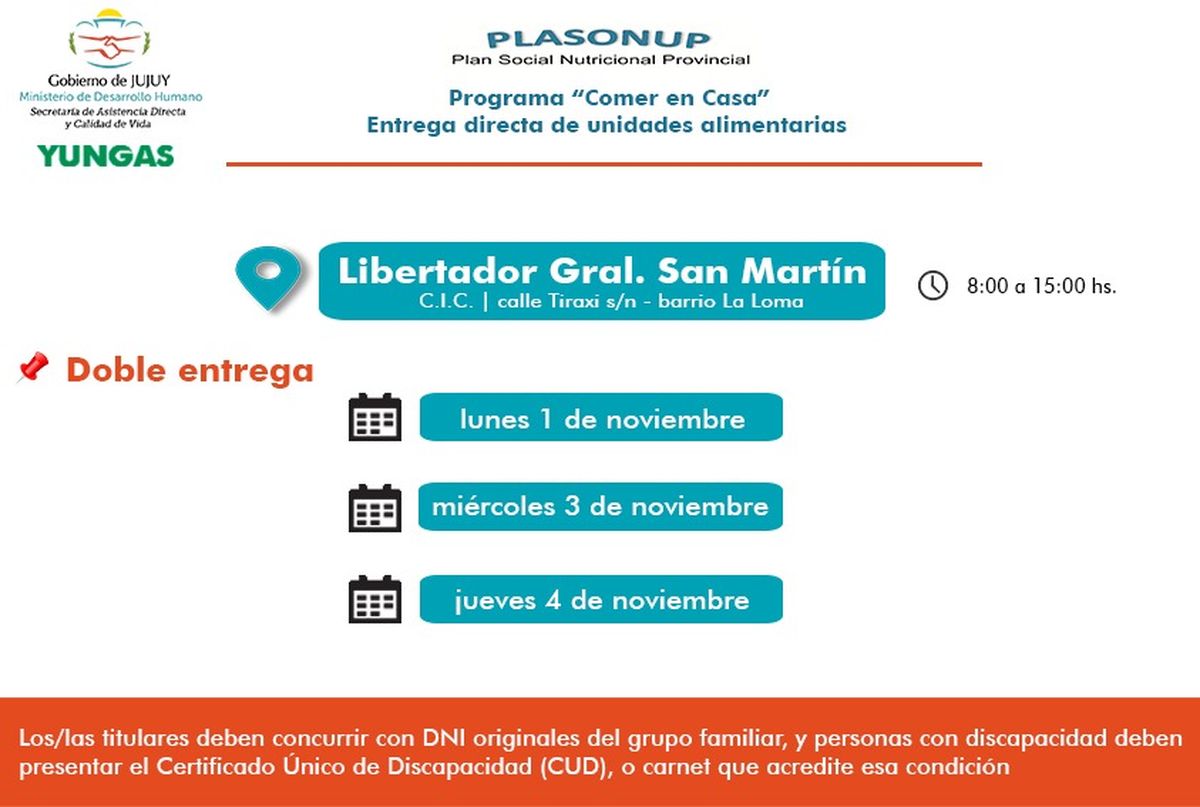 El Ministerio de Desarrollo Humano, a través de la Secretaría de Asistencia Directa y Calidad de Vida, comunica que desde el lunes 1° de noviembre se concretará la doble entrega de unidades alimentarias del Programa “Comer en Casa”, a familias de Libertador General San Martín, Caimancito y Rodeito