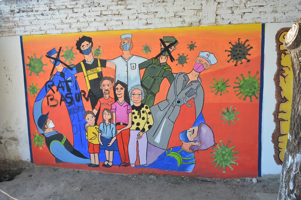 Hace apenas unos días, los sufridos estudiantes pertenecientes a esta promoción (2020) habían realizado esta pintada haciendo referencia a dos motivos de actualidad: sobre los héroes de la pandemia y la violencia de género.
