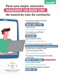 . http://salud.jujuy.gob.ar/asistenciavirtual/ haciendo click en el botón “Covid-19” de lunes a viernes de 8 a 20 horas (por síntomas Covid para seguimiento médico)