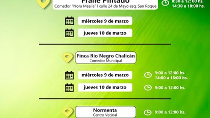 -En Finca Río Negro Chalicán, el miércoles 9 de marzo, en el Comedor Municipal, en los horarios de 9:00 a 12:00 y 14:00 a 18:00, y el jueves 10 de marzo, en el horario 9:00 a 12:00.