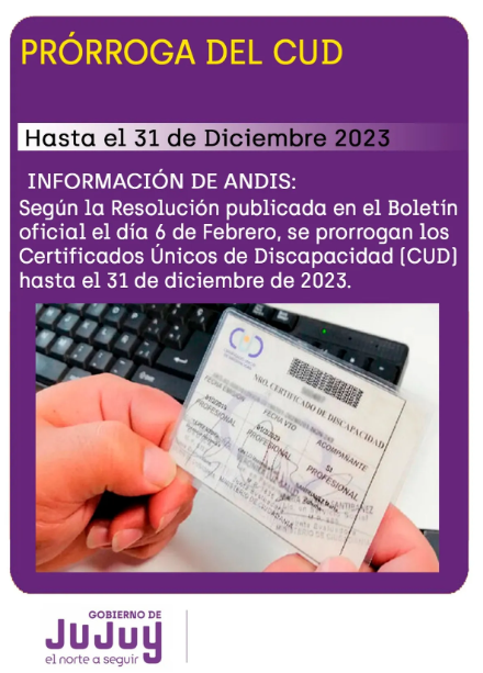 El Ministerio de Desarrollo Humano, a través de la Dirección Provincial de Inclusión de Personas, recordó a instituciones, obras sociales y personas con discapacidad que por Resolución 186/2023 de la Agencia Nacional de Discapacidad (ANDis) se prorrogó por el término de un (1) año, contado desde la fecha de su vencimiento, el Certificado Único de Discapacidad (CUD) con vencimiento entre el 1 de enero y el 31 de diciembre de 2023.