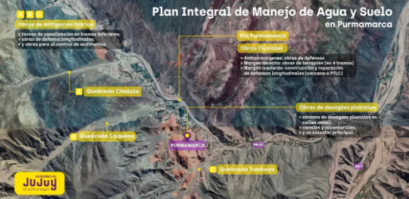 El Plan Integral de Manejo de Agua y Suelo fue gestado por la Dirección Provincial de Recursos Hídricos (DPRH) desde 2018 para reducir el riesgo para las poblaciones y la producción en las zonas de la cuenca del río Purmamarca, para lo que prevé obras fluviales en el río Purmamarca, con la incorporación de defensas en ambas márgenes.; obras de desagües pluviales en la ciudad, y obras en las quebradas de Chalala, Coquena y Tumbaya. (El detalle de cada conjunto de obras puede leerse aquí).