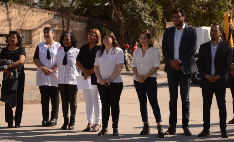 Fue una jornada cargada de emociones, desde muy temprano con la invitación a distintas docentes de la ciudad para el izamiento de nuestra Bandera Nacional estando presentes Marcelo Castro, Secretario de Gobierno, Danilo Montanari, Secretario de Modernización, Ariel Bravo, Secretario de Desarrollo Humano, la Diputada provincial Gisel Bravo, Marisa Vera, Directora de la Escuela 221 Unión Latinoamericana, Lorena Picardo, Vicedirectora, Magdalena López junto a Carmen Cansino, Directora y Vicedirectora de la escuela 414 Adolfo Kapeluz y Sabina Fernández, docente jubilada.