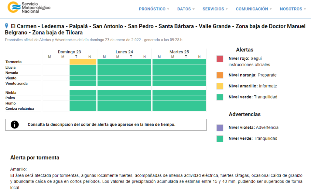 El SMN anunció que las áreas señaladas serán afectada por tormentas, algunas localmente fuertes, acompañadas de intensa actividad eléctrica, fuertes ráfagas, ocasional caída de granizo y abundante caída de agua en cortos períodos. Los valores de precipitación acumulada se estiman entre 15 y 40 mm, pudiendo ser superados de forma local.