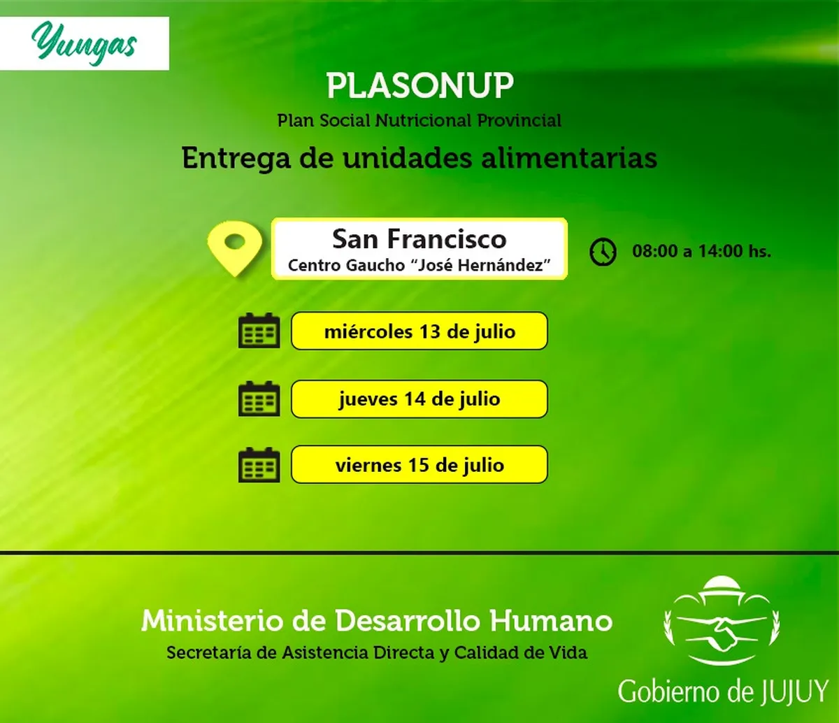 El Ministerio de Desarrollo Humano, a través de la Secretaría de Asistencia Directa y Calidad de Vida, comunica que desde el miércoles 13 de julio, se realizará la entrega de Unidades Alimentarias del Programa "Comer en Casa", a familias de San Francisco, del Departamento Valle Grande.