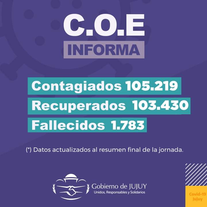 La Subdirección de Epidemiología informa en su Reporte Semanal que se confirmaron 13 nuevos casos de COVID-19 en Jujuy, recibieron el Alta Médica 11 pacientes.