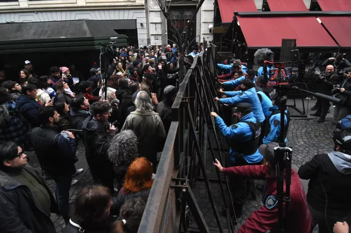 En un clima tenso, militantes de organizaciones de derechos humanos presionan sobre las vallas que dispuso la policía de la Ciudad de Buenos Aires alrededor de la Legislatura. Se realizan marchas a metros del edificio en donde Victoria Villarruel lanzó la convocatoria para homenajear a víctimas del terrorismo.