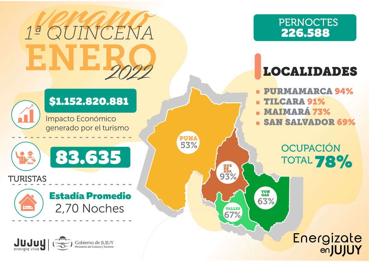 La ocupación total en la provincia durante esta quincena fue del 78%; con un 93% en Quebrada, 67% en Valles, 63% en Yungas y 53% en Puna. Los picos de visitas se registraron en las localidades de Purmamarca, Tilcara, San Salvador de Jujuy y Maimará. Mientras que la estadía promedio fue de 2,7 noches.