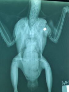 Según detalló el biólogo, “el ejemplar presentaba traumatismo del ala izquierda y un orifico en la parte pectoral donde se encontró una munición de un aire comprimido, por lo que inmediatamente fue revisado por el médico veterinario del CAFAju y posteriormente derivado para mayor observación”.