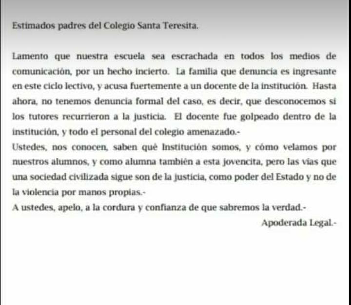 El Comunicado, redactado por la asesora legal de la institución, fue entregadoen forma virtual a los tutores de los alumnos de la institución, culpabilizando a los medios, obstruyendo la justicia y estigmatizando a una niña que pudo decir NO, a un abuso sexual por parte de su profesor.